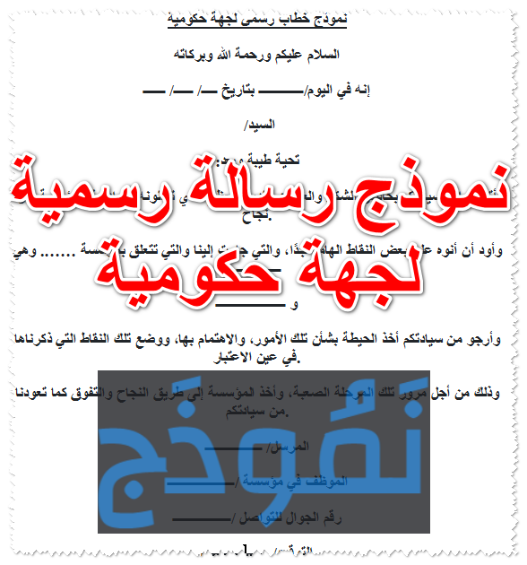يستخدم نموذج رسالة رسمية لجهة حكومية pdf و doc و word جاهزة للطباعة لتقديم شكوى أو طلب من وزير مثل وزير الصحة أو الداخلية خطاب رسمي لمدير الشركة والجامعة أو أي جهة إدارية ويمكنك كتابته بالانجليزي لصديق أو جهة رسمية خارجية وسنوفر لك ملفات بصيغ pdf أوdoc وword للتحميل وقابلة للتعديل على برنامج مايكروسوفت وورد.